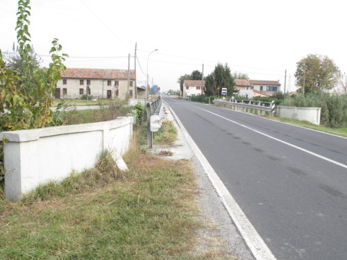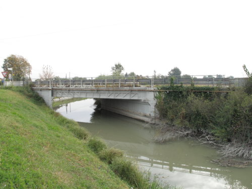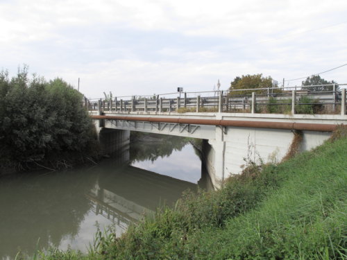 ponte in calcestruzzo a canna quadra, tipologia a travata con parapetto misto in ferro e pilastrini in cemento armato e guardrail, passaggio asfaltato.