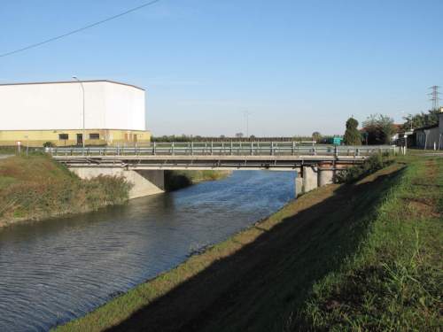 ponte a travata o travatina in cemento armato con parapetti in ferro e passaggio asfaltato provvisto di guardrail.