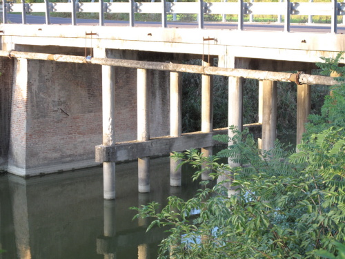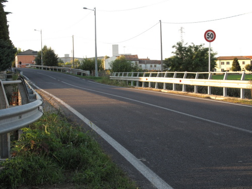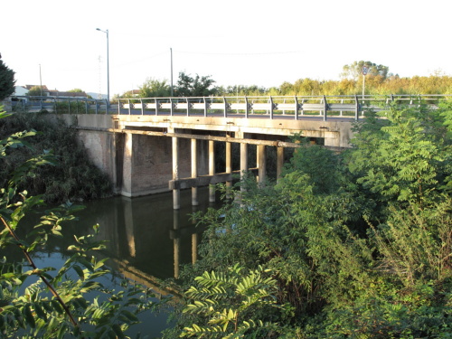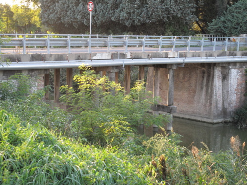 ponte a travata o travatina a canna quadra con spalle in muratura continua e pali e cordoli in cemento armato, parapetto coincidenti con il guardrail. Passaggio asfaltato, pianta adoppia C.