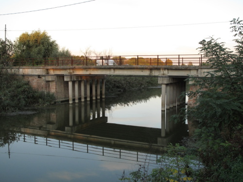 ponte a travata o travatina a canna quadra con spalle in muratura continua e pali e cordoli in cemento armato, parapetto in ferro "a giorno". Passaggio asfaltato e pianta a doppia C.