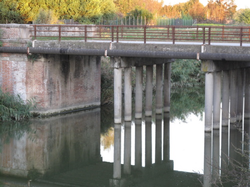 ponte a travata o travatina a canna quadra con spalle in muratura continua e pali e cordoli in cemento armato, parapetti misti in muratura continua e nella parte centrale in ferro "a giorno". Passaggio asfaltato e pianta a doppia C.