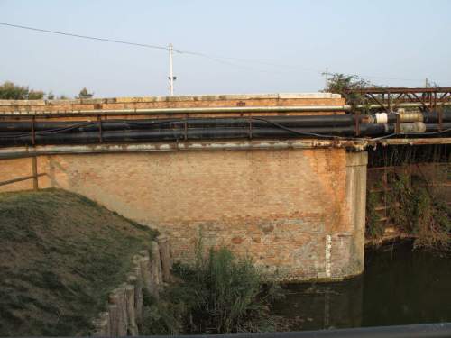 struttura in muratura continua a vista a travata a canna quadra con cinque chiuse metalliche scndite da possenti rostri curvilinei in muratura rifiniti in pietra sui quali poggia una complessa struttura metallica composta da parapetti metallici e panconature lignee. Spalle in muratura con parapetti pieni rifiniti con copertine in pietra, presenta pianta a doppia C.