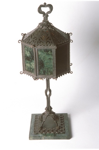 Lanterna da tavolo con base quadrata in marmo verde di carinzia, stelo fissato alla base attraverso quattro foglie; la lanterna ad una luce è ottagonale con specchi ciechi anch'essi in marmo di carinzia.