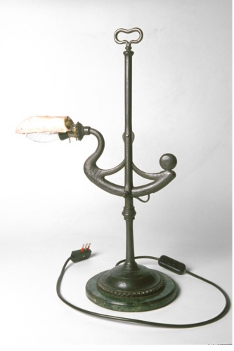 Lampada ad una luce con parte centrale costuita come un bilancere per poter inclinare la lampada; lo stelo poggia su un base circolare.