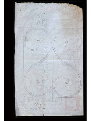 Il foglio è il retro della pagina di un calendario, al centro è stato disegnato il profilo di due volute ad 'esse' inscritte in un rettangolo a sviluppo verticale di cui sono tracciati tre lati, il lato di sinistra corrisponde al bordo di sinistra del foglio. Il rettangolo è diviso a metà in senso verticale, e in ciascuna metà è stata tracciata una delle due volute che risultano quasi speculari tra loro. La parte inferiore e superiore del foglio sono stati utilizzati per fare dei calcoli. Il bordo del lato superiore del foglio è slabbrato in quanto è il lato in cui la pagina è stata strappata.