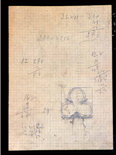 Pagina di quaderno a quadretti: nella parte destra in basso è stato tracciato un quadrato all'interno del quale sono state disegnate tre curve che delineano una sorta di trifoglio; le curve sono tangenti ai lati del quadrato. Sul foglio sono scritti dei numeri e delle cifre messe in colonna per la realizzazione di calcoli matematici.
