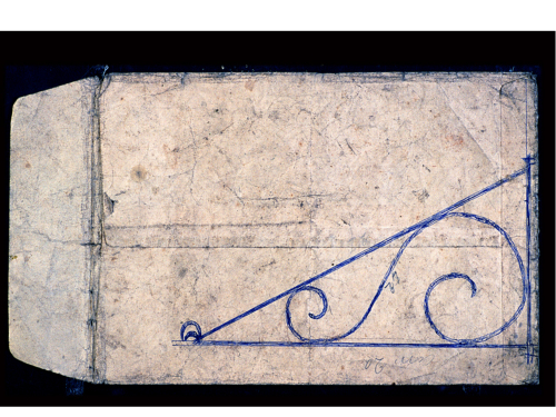 Fronte di una busta sul quale è stato tracciato un disegno. Il disegno si compone di una voluta a 'esse' a sviluppo longitudinale inscritta in un triangolo. Il disegno occupa il lato in alto a sinistra del fronte della busta.