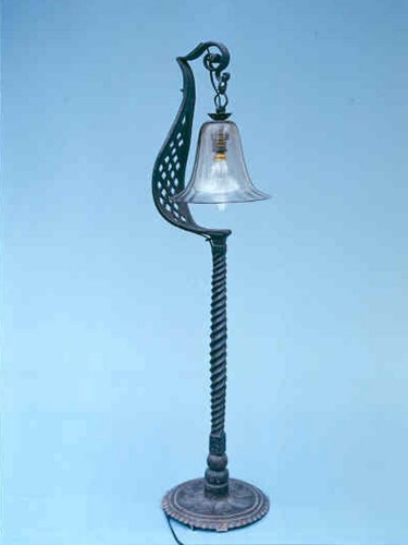 Lampada da tavolo ricavata da una barra quadra di ferro forgiata alla base sino ad ottenere una placca circolare decorata con incisioni a caldo. Lo stelo della lampada è inciso e scanalato e per tre quarti della sua lunghezza lavorato a tortiglione. All'estremità superiore dello stelo è applicata con chiodatura una griglia traforata forgiata a forma di elsa o testa di cobra che sorregge un riccio porta lamapda con campana in vetro trasparente. La patinatura è quella originaria color marrone scuro.