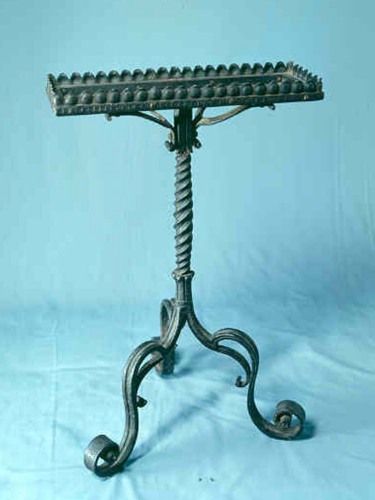 Tavolino su tre piedi a ricci con stelo a tortiglione. Tre piccoli bracci ottenuti da ferro piatto sorregono la mensola rettangolare del piano d'appoggio anch'esso in ferro forgiato inciso.