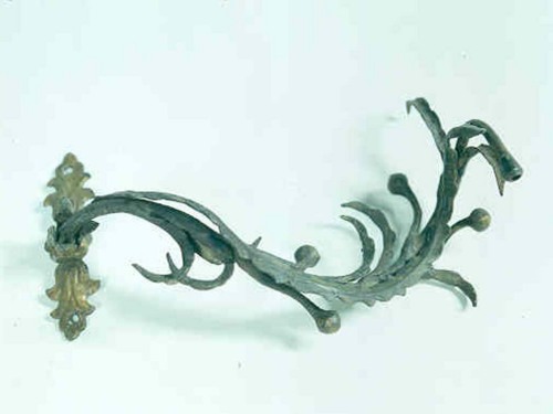 Piccola placchetta a muro con braccio porta lampada ad una luce. La placca è realizzata con una lamina di ferro piatto ritagliata, incisa e forgiata ad essa è applicato un braccio con motivi di foglie e bacche realizzate in lamiera di ferro sottile, piegata e lavorata a freddo. Patinatura verde a finto bronzo originale.