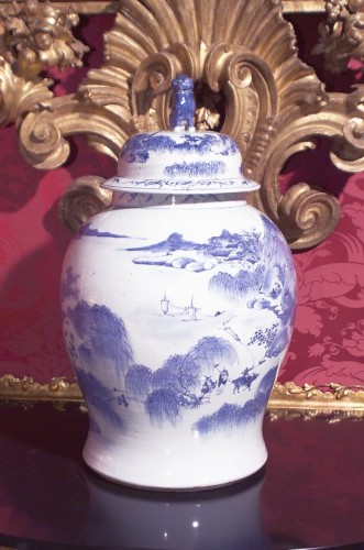 Vaso in porcellana con coperchio sormontatao da un leone.