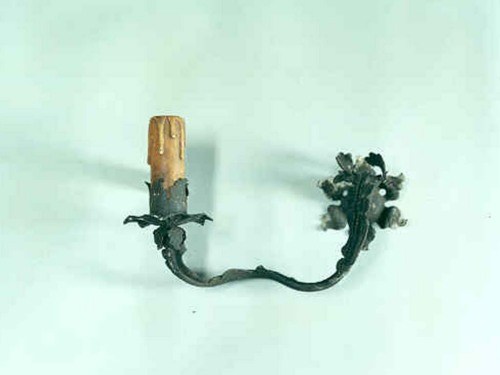 Braccio porta lampada o porta candela ottenuto da lamina di ferro forgiata, sagomata e ritagliata che viene applicata al muro mediante una placca composta da più foglie ricavate da lamine di ferro.
