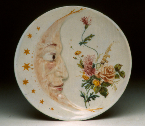 piattino rotondo con orlo rialzato; decorazione policroma parzialmente a rilievo