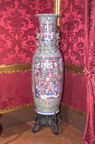 Vaso in porcellano a forma di anfora con collo allungato. Decorazione ricca con scene di guerra e motivi tipici dell'arte orientale, Manici zoomorfi. Base in bronzo.