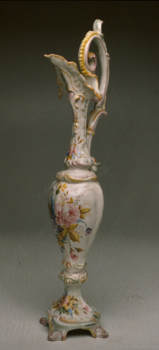 grande vaso a ventre allungato con manico sopraelevato a spirale, piedistallo con peducci di sostegno; decoro policromo