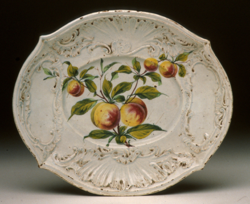 piatto ovale utilizzato come vassoio di zuppiera, con cavetto appena accennato e ampia tesa decorata a rilievo; decoro policromo al centro