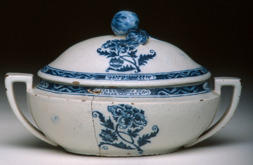 zuppiera ovale biansata con coperchio caratterizzato da presa conformata a frutto; decoro in moncormia blu