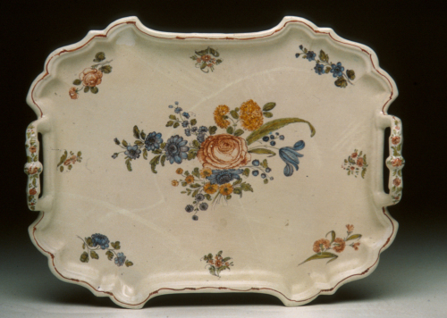 vassoio rettangolare con orlo mistilineo, dotato di due manici in corrispondenza dei lati brevi; decoro policromo