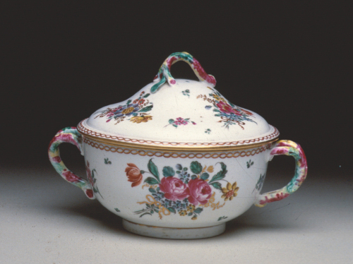 tazza da brodo biansata con coperchio, senza piatto; decoro policromo lungo le pareti della tazza e sul coperchio