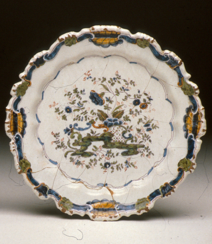 piatto rotondo con tesa frastagliata; decoro policromo nel cavetto e sulla tesa