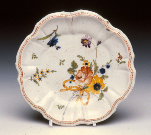 piatto rotondo con tesa a coste e orlo mistilineo; decoro policromo