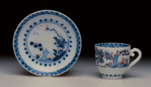tazzina alta con anello e manico a ricciolo con bottoncino a rilievo; piattino con orlo liscio; decoro policromo
