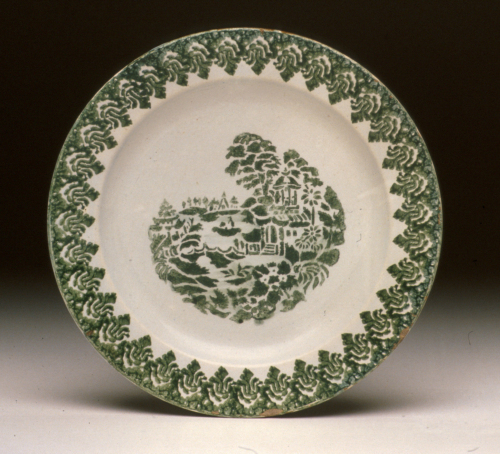 piatto rotondo con cavetto a calotta schiacciata, tesa liscia; decoro in monocromia verde