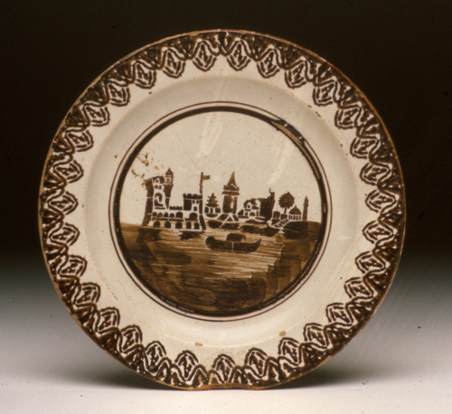piatto rotondo con cavetto a calotta schiacciata, tesa liscia; decoro in monocromia marrone