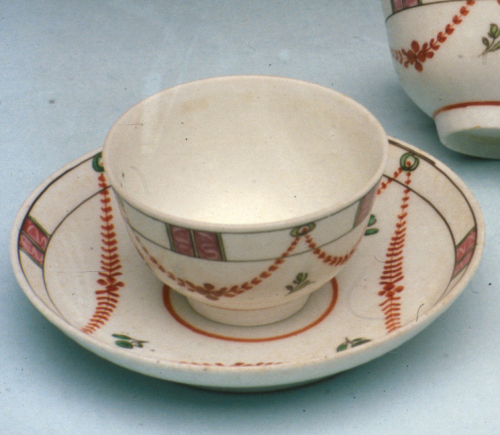 tazzina a coppetta su base ad anello, senza manico; piattino con orlo leggermente rialzato; decoro policromo