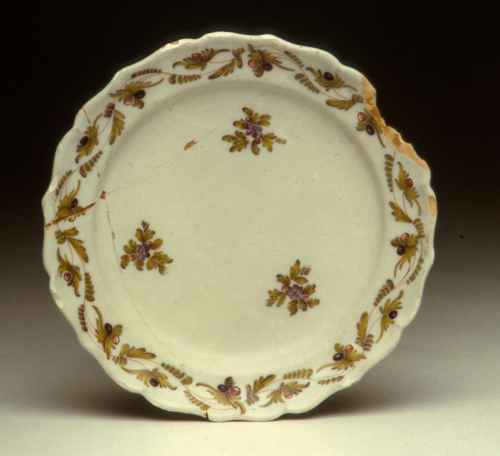 piatto rotondo con cavetto appena accennato e orlo lievemente centinato; decoro policromo