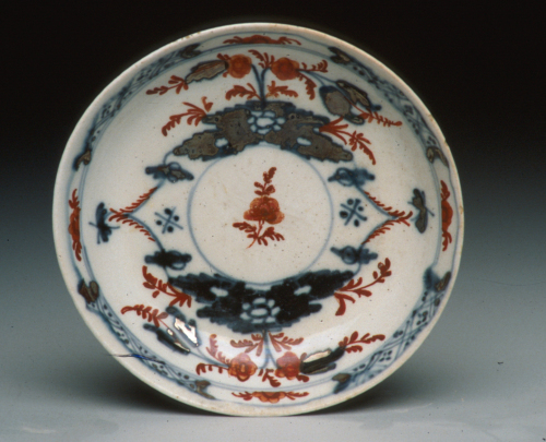 piattino con orlo liscio rialzato; decoro in bicromia