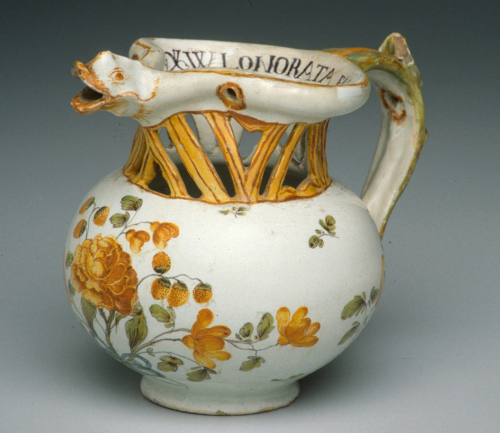 "bossa buffona" (che inganna chi tenta di versarne il contenuto) a forma globulare con orlo realizzato a traforo e labbro ingrossato, bocca trilobata con versatoio conformato a testa di animale, ansa sagomata; decoro policromo