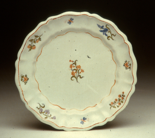 piattino rotondo con cavetto appena accennato, tesa a coste e orlo mistilineo; decoro policromo