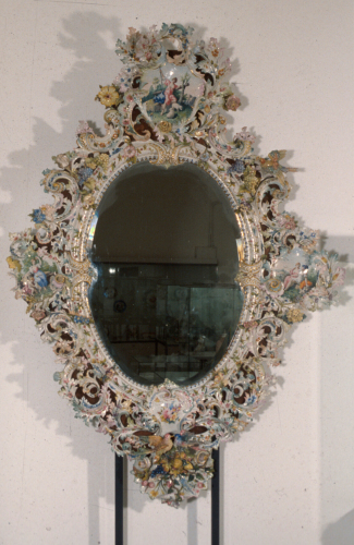 specchiera di grandi dimensioni modellata a rocaille e dipinta in policromia