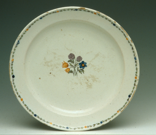 piatto rotondo con cavetto appena pronunciato e tesa liscia; decoro policromo nel cavetto e lungo la tesa