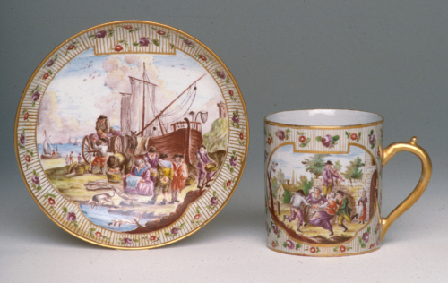 tazzina cilindrica con manico a orecchio e bottoncino, piattino con orlo liscio leggermente rialzato; decoro policromo