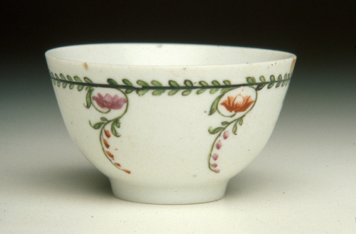 tazzina a coppetta senza manico su base ad anello; decoro policromo