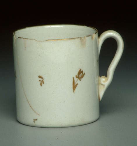 tazzina cilindrica con manico ad orecchio; decoro realizzato a doratura