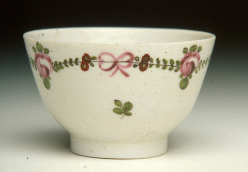 tazzina a coppetta senza manico su base ad anello; decoro policromo