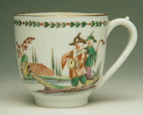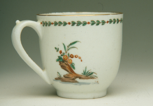tazzina alta su piede ad anello, presa ad orecchio con bottoncino a rilievo; decoro policromo con dorature