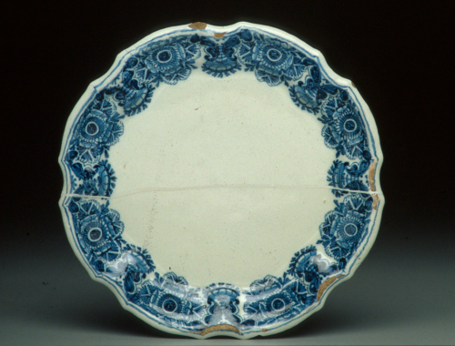 piatto rotondo con tesa a coste e orlo mistilineo; decoro in monocromia blu