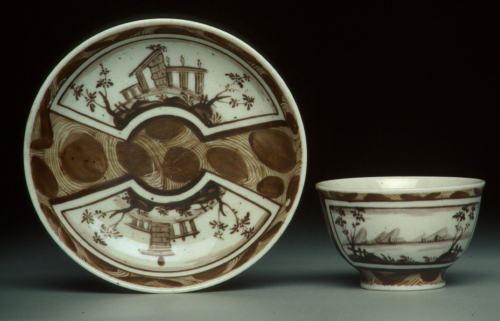 tazzina a coppetta senza manico su base ad anello, piattino con orlo rialzato; decoro in monocromia marrone