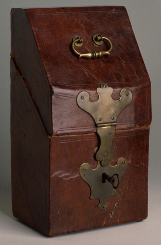 coltello con manico in maiolica, decorato in policromia e inserito in cofanetto di pelle