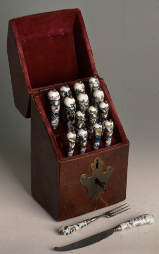 forchetta con manico in maiolica decorato in policromia, inserita in cofanetto di pelle