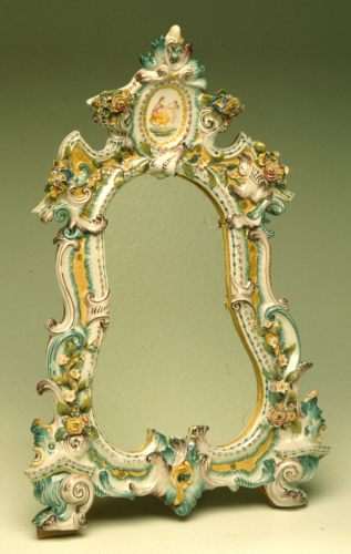 piccola specchiera da tavolo con cornice in maiolica e dorso in legno traforato; decoro policromo