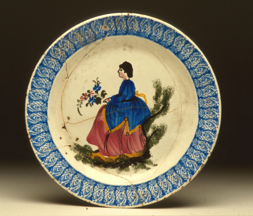grande piatto rotondo con cavetto a calotta schiacciata e tesa liscia; decoro policromo