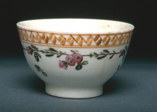 tazzina a coppetta senza manico su base ad anello; decoro policromo