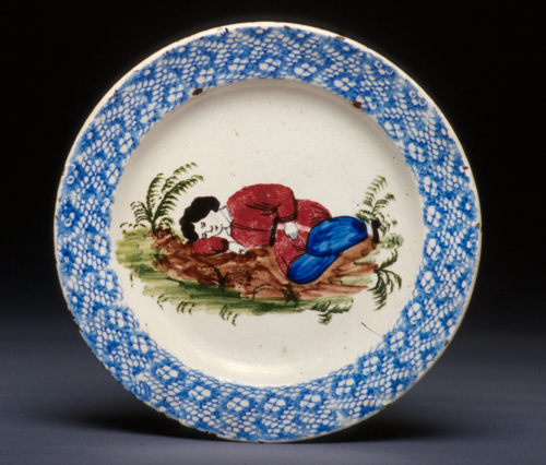 piatto rotondo con cavetto a calotta schiacciata, tesa liscia; decoro policromo