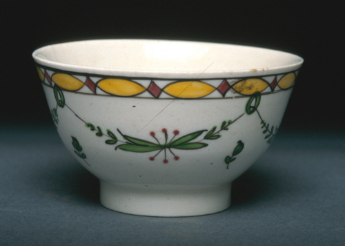 tazzina a coppetta senza manico su base ad anello; decoro policromo