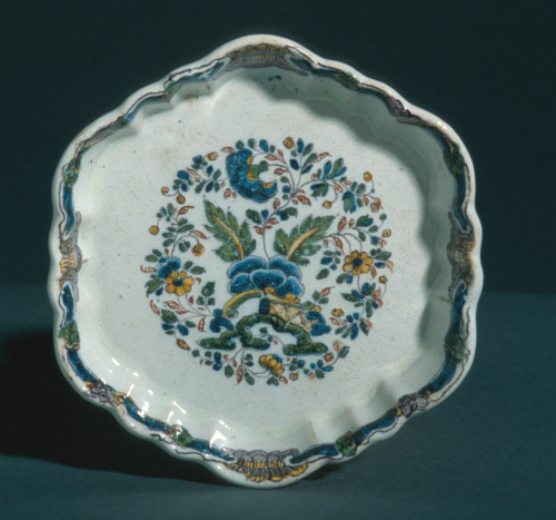 piattino esagonale sottobottiglia o sottobicchiere con orlo rialzato a coste; decoro policromo